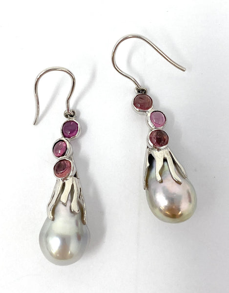 14k White Gold Pearl Drop Earrings with Purple Stones 7.5g